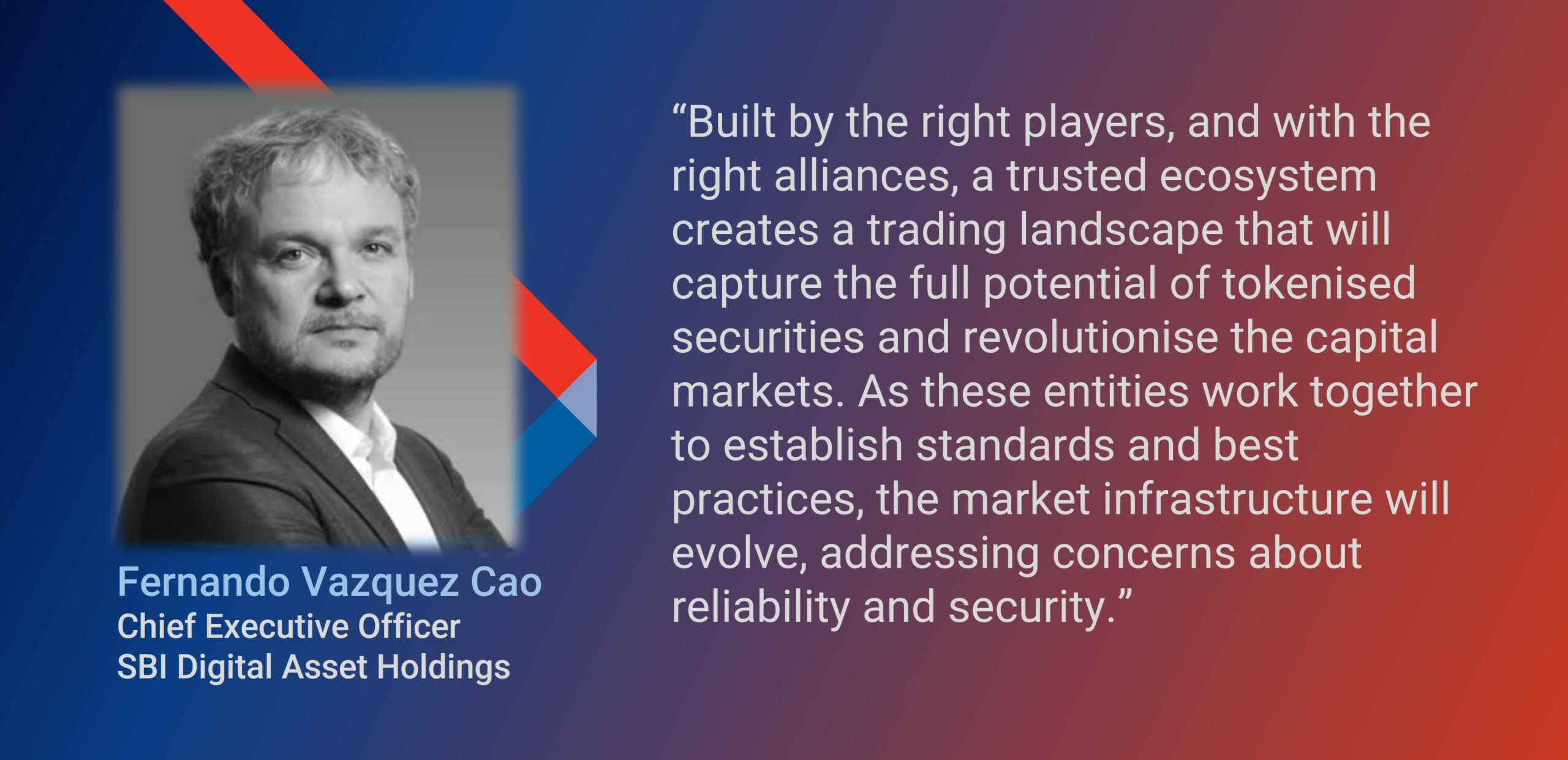 Built by the right players, and with the right alliances, a trusted ecosystem creates a trading landscape that will capture the full potential of tokenised securities and revolutionise the capital markets. As these entities work together to establish standards and best practices, the market infrastructure will evolve, addressing concerns about reliability and security. It’s also important to recognise that trust is not solely the responsibility of one party but is built collaboratively across the entire ecosystem. Regulatory frameworks play a crucial role in ensuring the legitimacy of tokenised assets, and by working closely with regulators, financial institutions can contribute to the establishment of a robust regulatory environment that instils confidence in market participants.